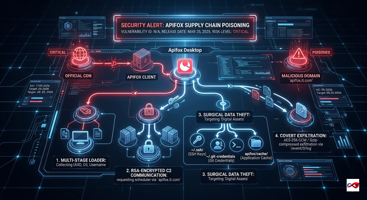 Apifox has fallen victim to a supply chain poisoning attack. By tampering with the official CDN-hosted event tracking script, `apifox-app-event-tracking.min.js`, attackers have successfully implanted a high-risk Trojan loader into the client application.